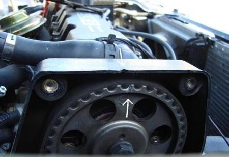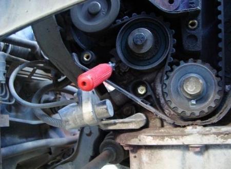 Не снимайте полностью болт крепления, достаточно наживить его назад и пытаться состыковать метки на шкивах коленчатого и распределительного валов, делается это путем вращения за него двигатель. Теперь надежно фиксируем натяжной ролик и аккуратно снимаем ремень, проводя его за открученным насосом ГУРа. При необходимости натяжной ролик следует заменить на новый.
